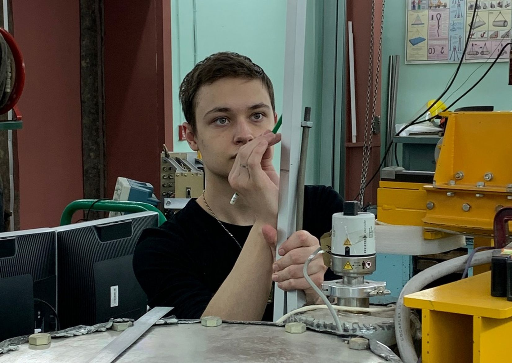 Ученик 11 класса ФМШ Данил Тищенко узнал о возможности принять участие в работах ИЯФ  благодаря традиции шефства, которая предполагает, что ученики физматшколы, проучившиеся там год, делятся опытом с новым набором учащихся. Шефы Данила прошли практику в лаборатории ИЯФ и рассказали ему о такой перспективе. «Я тоже загорелся идеей поучаствовать в исследованиях института, — рассказал Данил. — Мои шефы посоветовали обратиться к Алексею Михайловичу Медведеву, преподавателю нашего инженерного спецкурса, который по совместительству является сотрудником ИЯФ. Договориться удалось быстро, и в декабре 2019-го я пришел к нему в лабораторию, на установку электронно-лучевой сварки. Сначала мне провели обзорный инструктаж, показали, как она работает, чем занимались здесь ребята до меня. Почти сразу наметилась задача, которую необходимо было выполнить: требовалось придумать и создать механизм, помогающий при открытии вакуумной камеры».